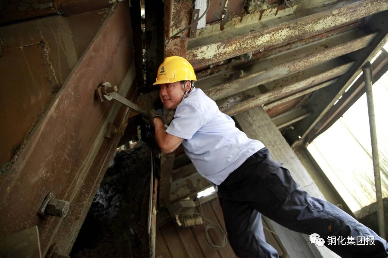 下了皮帶廊,走到主井礦倉(cāng)下,老郭自豪地指著頭頂上方:“8個(gè)漏斗,過(guò)去維修和更換都是委外,現(xiàn)在都是我?guī)俗约焊伞《嗌馘X我不曉得,自己的事情就該自己干,能省一個(gè)是一個(gè)!”說(shuō)到興奮時(shí),他還掏出手機(jī)上圖片給我講2個(gè)月前他們打的一場(chǎng)硬仗:主井35米礦倉(cāng)漏斗因礦石提運(yùn)沖擊導(dǎo)致四邊混凝土嚴(yán)重磨損,礦業(yè)公司聽取老郭的建議,準(zhǔn)備為漏斗四邊安裝4塊鋼板以保護(hù)受損的混凝土墻體。為了最大限度減少對(duì)主井出礦的影響,只給他們48小時(shí)的停產(chǎn)時(shí)間。頭一次接這大活的老郭也沒犯怵,提前準(zhǔn)備好鋼板、木條等材料,將8名維修工分成3班,白班和小夜班清漏斗、制作安裝安全護(hù)板、鑲嵌鋼板,大夜班專門焊接鋼板。啃了2天的方便面,提前2小時(shí)完工將漏斗交付使用……